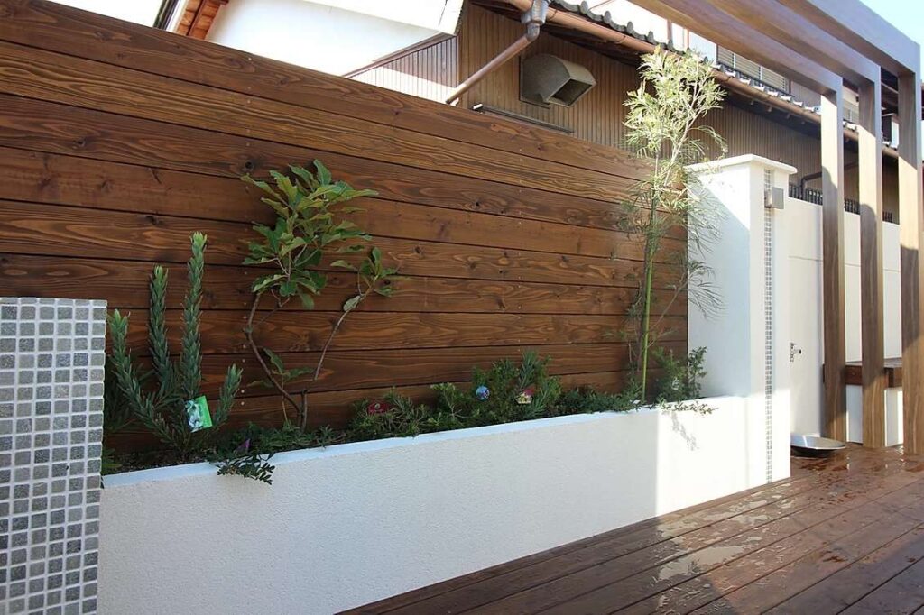 庭工事。リフォームデザインの大型工事のご紹介です。 天然木ウッドデッキとタイルテラスを組み合わせ、テラス屋根はLIXILの+Gを造作しベンチなどと一体化させてデザインしました。 テラスのタイルは独特な模様のデザインタイルを仕様。模様はありますが上品なトーンに抑えてあるので、うるさくならず高級感のある模様です。 出てすぐをウッドデッキにすると、リビングからの段差なく外に出られ、足ざわりも良く、心地よい空間に。一段降りてタイルテラスとなるのでメンテナンス性も良く、BBQなど火を使うことも可能。見た目だけでなく使い勝手の良い組み合わせです。 リクシルさんの+Gのテラス屋根はカスタマイズ性が高く、今回は奥のベンチ側を木目+ダウンライト仕様に。手前側は光を取り入れるポリカ仕様にしております。天然石貼りの壁と相性も良く、中から見たときのアクセントになるようデザインしております。 シンクも造作で作成しモザイクタイルと組み合わせておしゃれに演出。人工芝の緑も映えて、メンテナンスとデザイン性を兼ねそろえたお庭へと変貌しました。 夜景が美しくなるよう、階段やベンチ下には間接照明、テラスにはダウンライト、アクセント壁の植栽上にもブラケットライトを設置し、庭全体が照らされるように配置しました。 ガラスは海外で制作を依頼したオリジナルガラス。細部まで拘った仕様となっております。