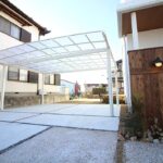 門柱下にはグランドカバーとなる植栽を添え、駐車スペースには大型のカーポートと土台となるアプローチを設置。