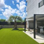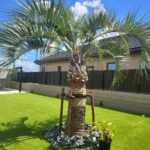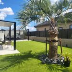 リフォーム外構工事とガーデン工事。ココスヤシをシンボルツリーに添えた存在感のあるデザイン。