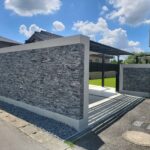外構部分は白い壁に天然石を貼り合わせてデザイン。