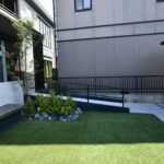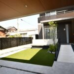 奥のお庭スペースは玄関ポーチと同品のタイルを使用し、人工芝を敷き詰めました。